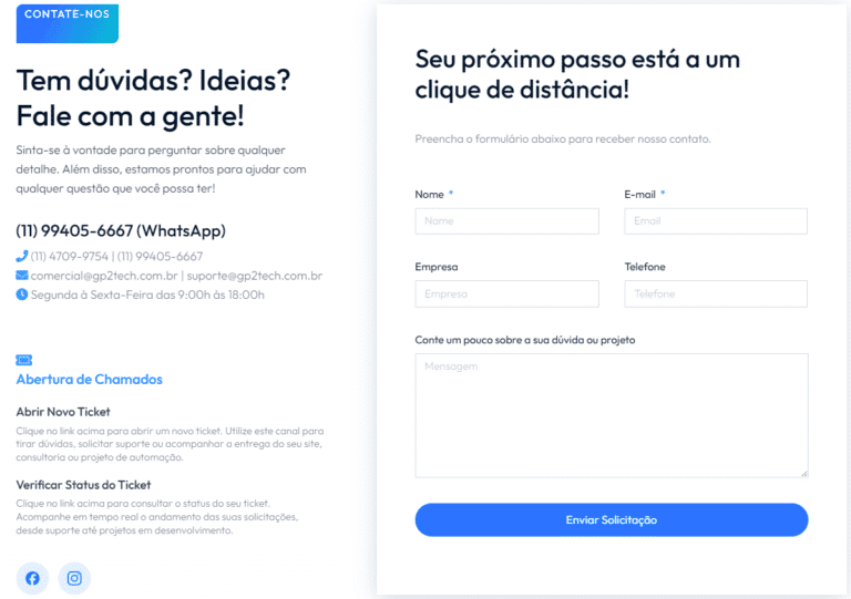 Criamos formulários personalizados e conectados ao seu e-mail ou CRM, garantindo organização, agilidade e respostas rápidas para quem entra em contato pelo site.